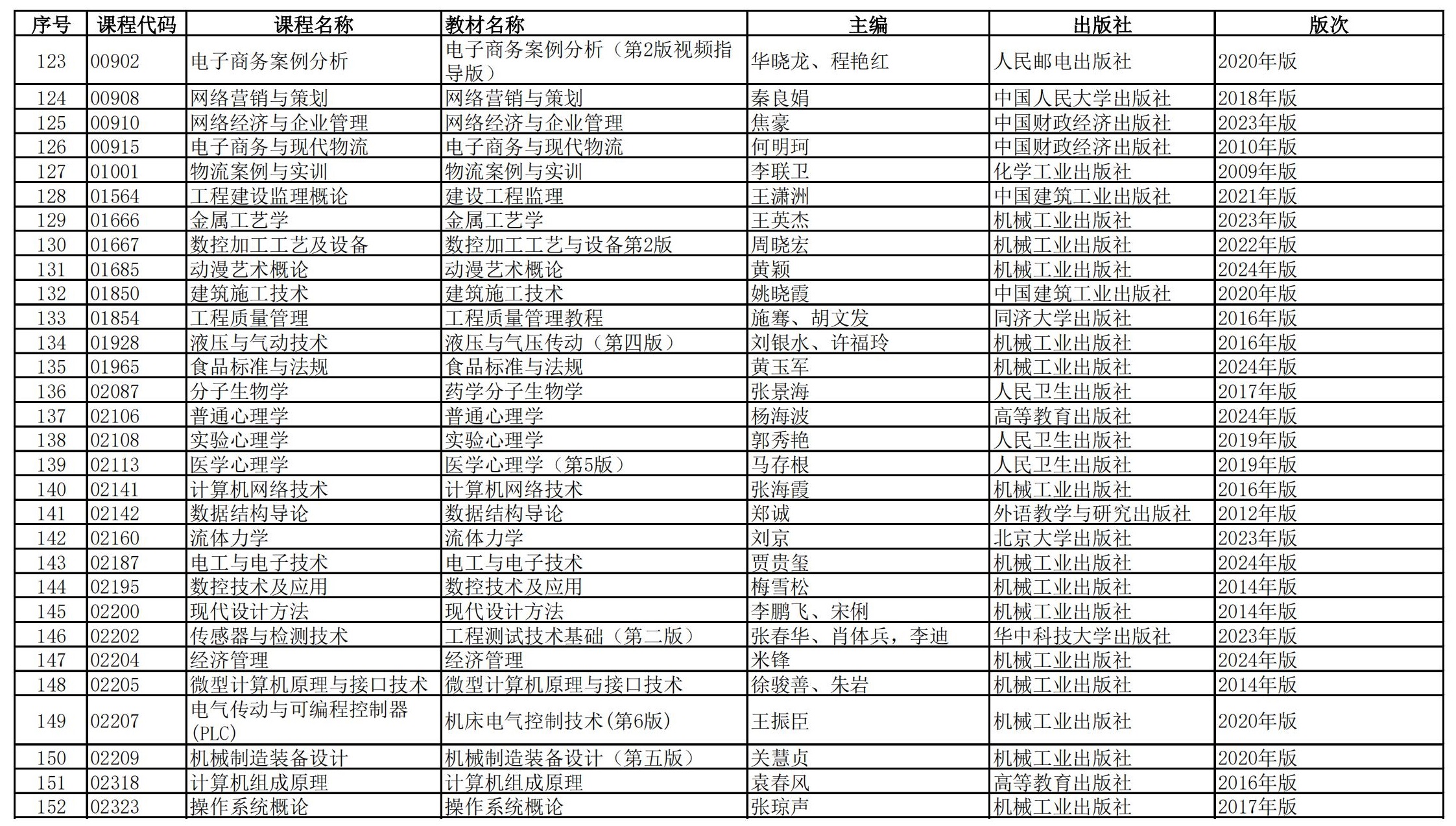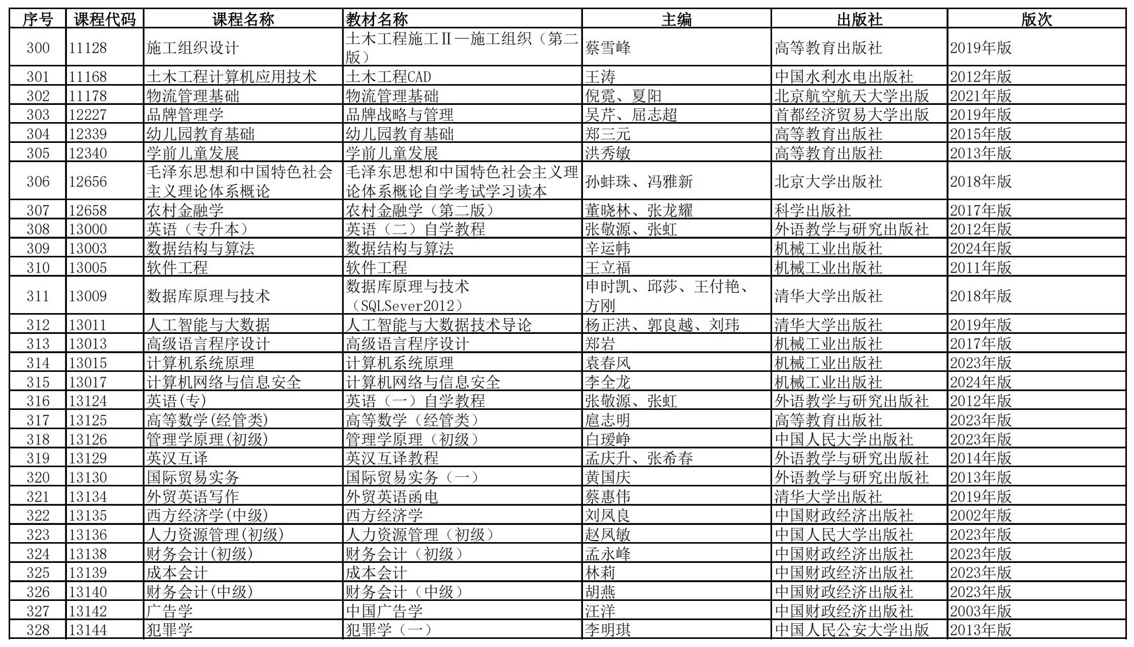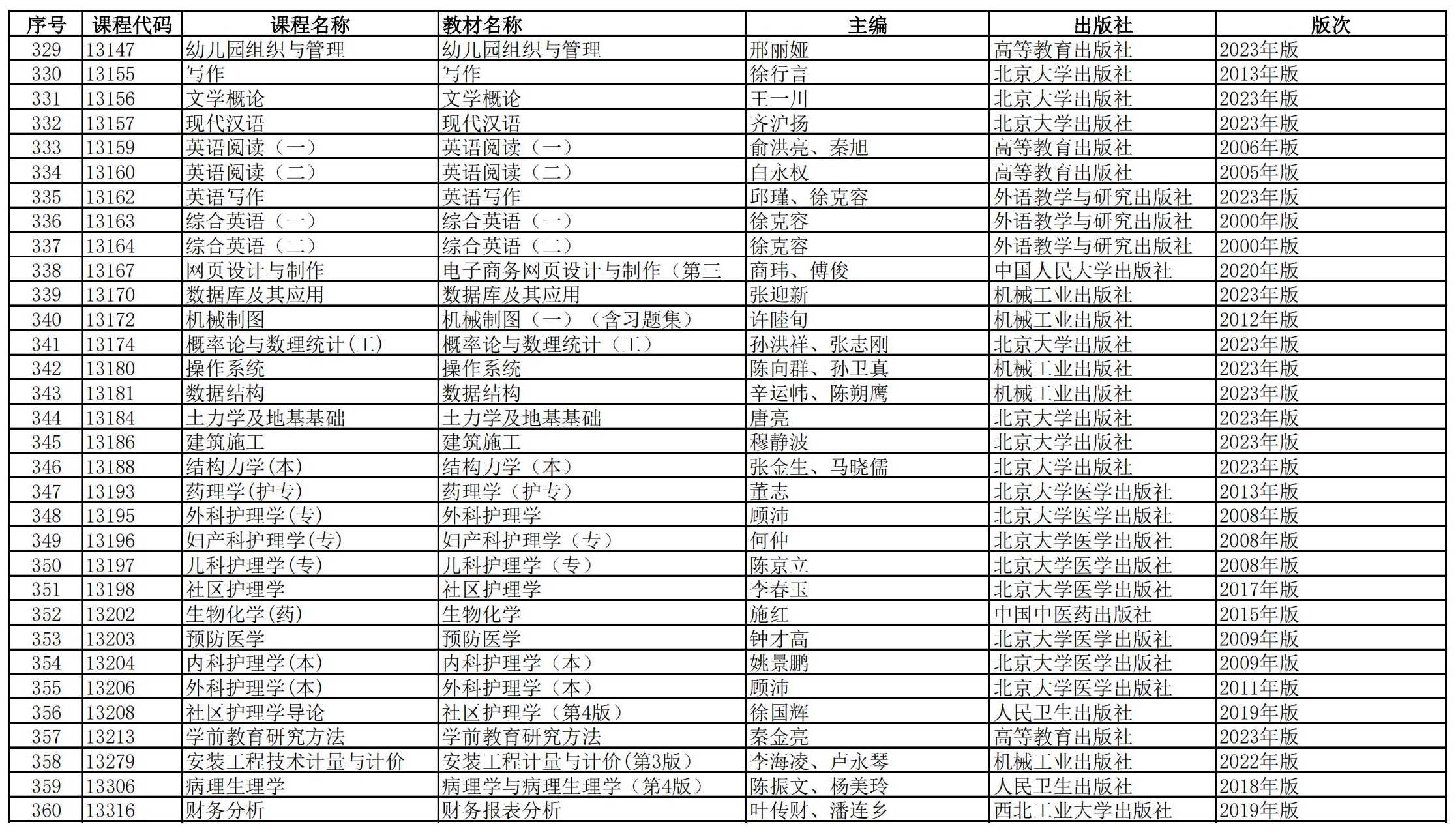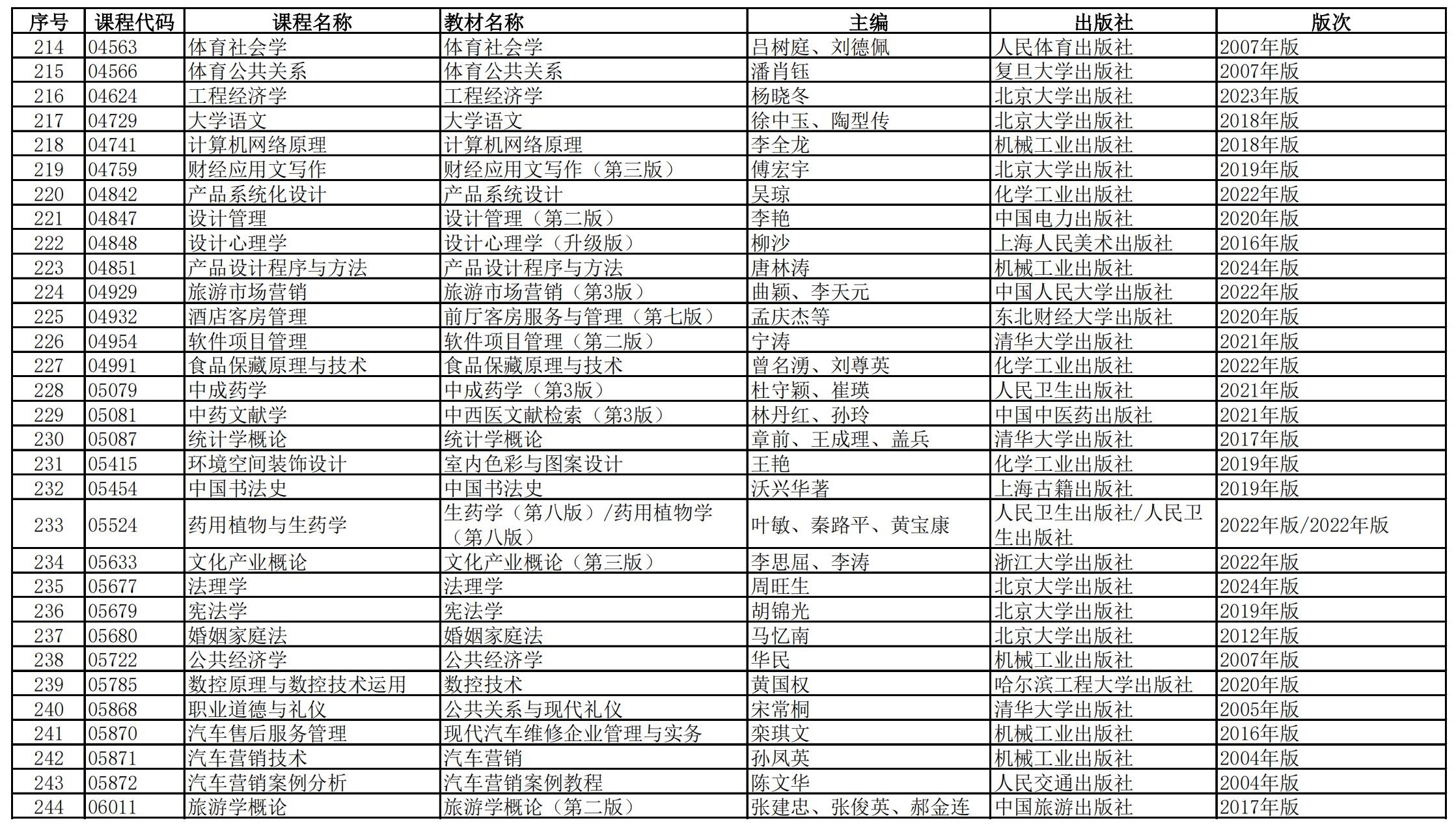 福建省高等教育自学考试理论课程参考教材目录(2023年修订版专业计划)