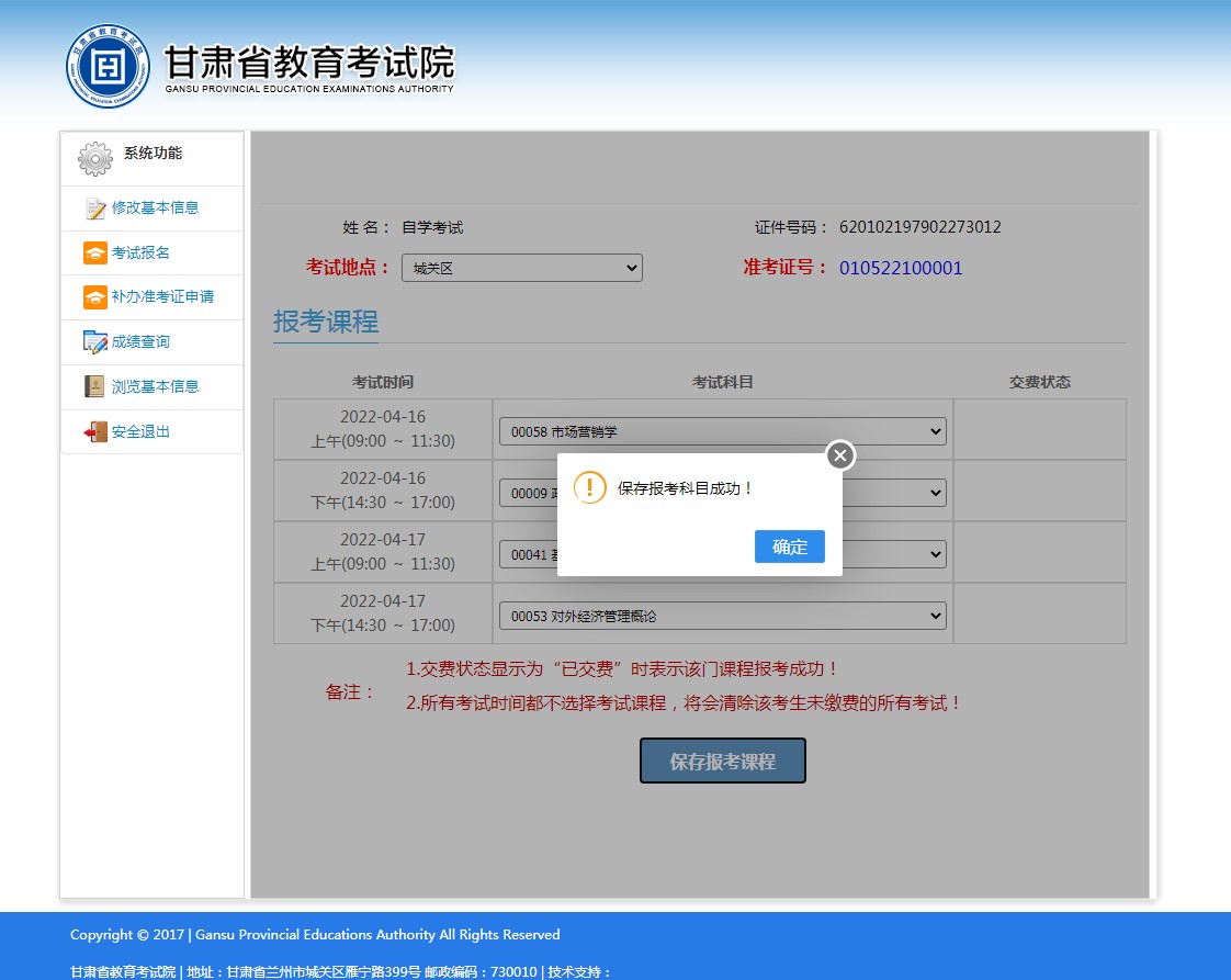 按照考试时间,下拉框显示本次考试所有科目,选择完成后,点击“保存报考课程”。