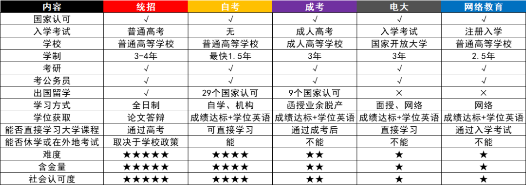 (五大学历形式清晰对比)