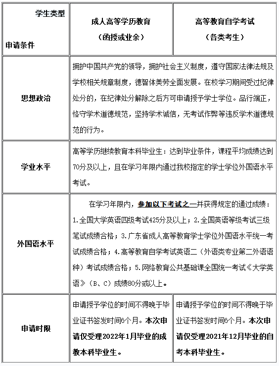 根据学校学位授予工作安排和《华南师范大学学士学位授予工作细则(修订)的通知》(华师[2021]144号)文件规定,结合当前新冠肺炎疫情防控工作要求,现将华南师范大学2022年夏季成人高等学历教育、高等教育自学考试本科毕业生学士学位授予工作具体事项通知如下: