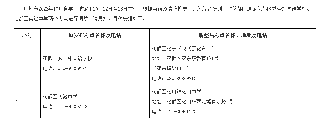 根据当前疫情防控要求,经综合研判,对花都区原定花都区秀全外国语学校、花都区实验中学两个考点进行调整,花都区秀全外国语学校调整为花都区花东学校(原花东中学),花都区实验中学调整为花都区花山镇花山中学。