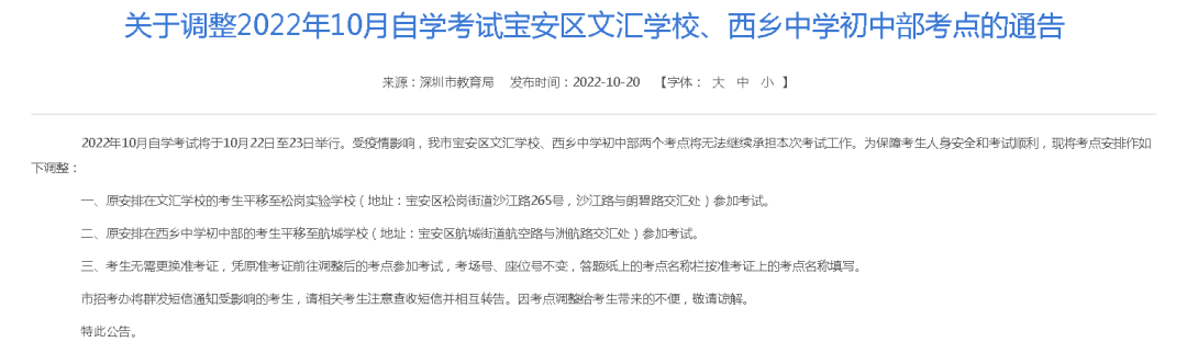 受疫情影响,深圳宝安区文汇学校、西乡中学初中部两个考点将无法继续承担本次考试工作。为保障考生人身安全和考试顺利,现将考点更改为松岗实验学校和航城学校。
