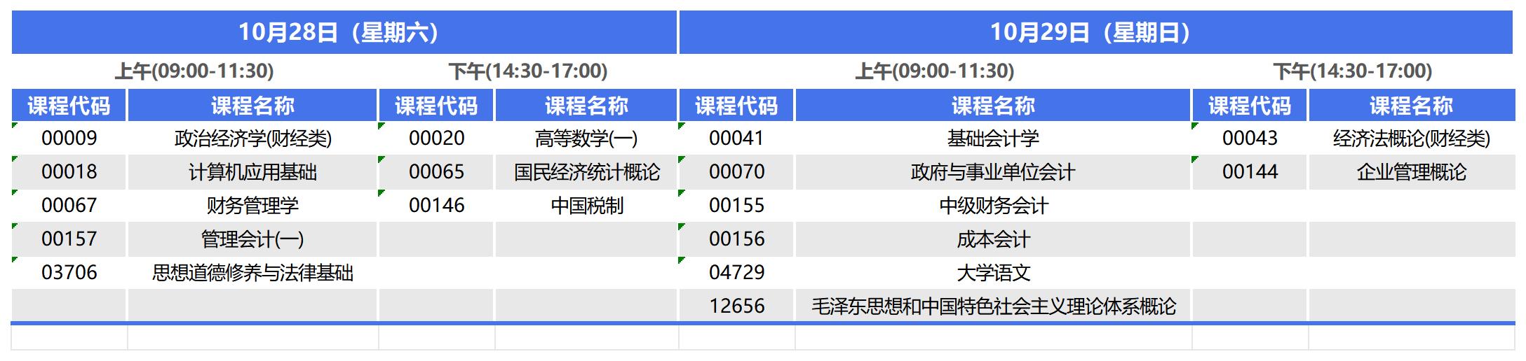 河北自考专科会计专业,专业代码630302(原专业代码:020203),2023年10月自考考试时间为10月28日-29日,上午9:00-11:30,下午14:30-17:00,本次考期共开考16门课程,具体科目安排如下:
