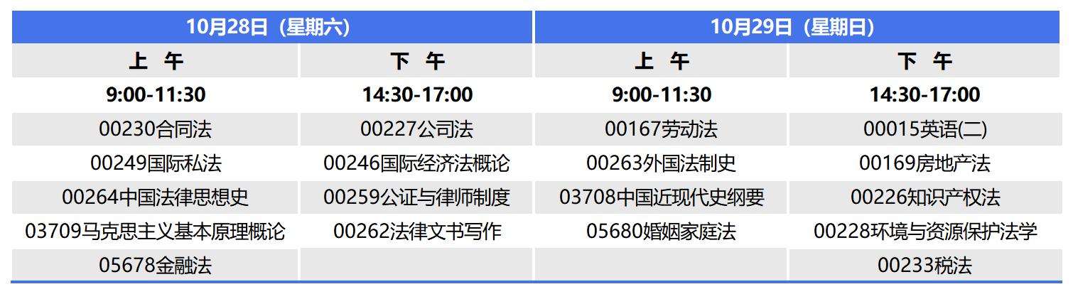 河南自考本科法学专业(原专业名称:法律),专业代码030101K(原专业代码:030106),2023年10月自考考试时间为10月28日-29日,上午9:00-11:30,下午14:30-17:00,本次考期共开考18门课程,具体科目安排如下: