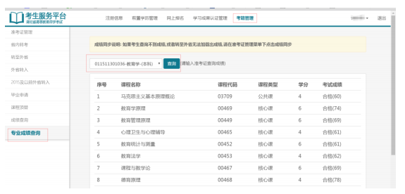 考生登录湖北省高等教育自学考试考生服务平台,进入考籍管理--专业成绩查询页面,可以选择一个本人的专业来查询成绩(如下图所示),成绩查询不出来请先在准考证管理中同步成绩。