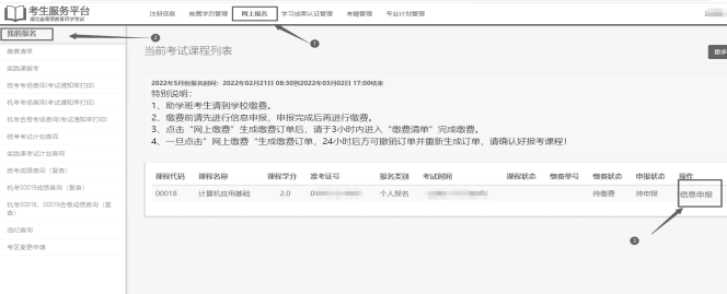 2023年4月份统考报考工作即将开始,本次考试时间为2023年4月14-16日,共3天。从2022年10月份的报考开始,操作流程增加了【信息申报】环节,操作方法为:先按以往方式报考课程,然后在报考记录的最后1列点击【信息申报】,信息申报成功才算报考完成,并请在规定的时间完成缴费操作,操作步骤截图见本通知最后,考试安排及教材大纲见附件。