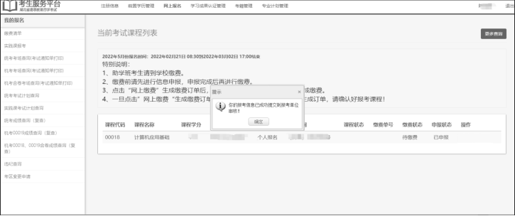 5、看到【你的报考信息已成功提交到报考单位审核】弹窗提示,报考操作步骤才算完成,然后按照学校的缴费流程完成缴费。缴费截止后,学校统一进行审核,未【信息申报】、未缴费的数据无法审核,其报考无效。