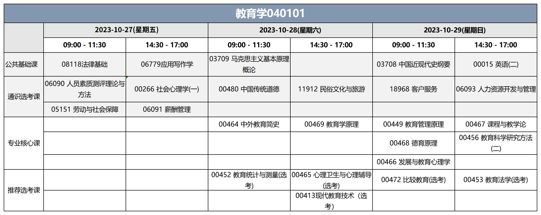 2023年10月湖北自考本科教育学专业,专业代码为040101,考试时间为10月27日-29日(周五至周日共3天),上午9:00-11:30,下午14:30-17:00。