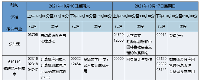 2021年10月湖南自考专科物联网应用技术专业考试时间为2021年10月16日-17日,2021年10月湖南自考专科物联网应用技术专业课程安排如下: