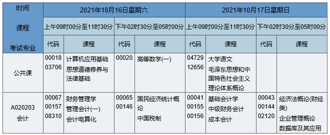 2021年10月湖南自考专科会计专业考试时间为2021年10月16日-17日,2021年10月湖南自考专科会计专业课程安排如下: