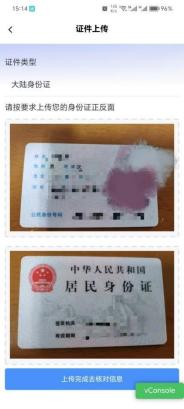 分别点击头像面、国徽面,弹出的下拉菜单可以选“拍摄”或“从相册选择”上传身份证照片,上传成功后,点击下方的“上传完成请核对信息”按钮,打出如下图所示窗口。