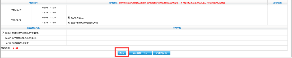 选择好课程后,点击“提交”按钮,系统将保存好报考课程信息,提交成功后,课程将以蓝色字体显示。