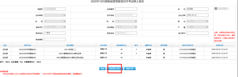 考生在进行网上支付前,请仔细核对您要报考的课程,只有在核对无误后才进行网上支付,点击界面上“进行网上支付”按钮,系统将自动创建支付订单。考生24小时内未支付成功的,报考无效。
