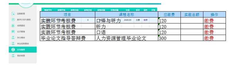 3.进入学生界面,查看本人缴费项目,确认缴费项目,点击该项目行的最后一项“缴费”,进入该项目缴费确认页面。