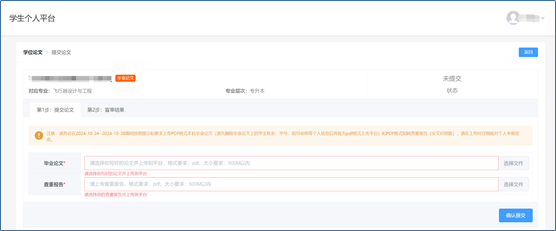 请按照提示和要求上传PDF格式本科毕业论文(请先删除毕业论文上的学生姓名、学号、指导老师等个人信息后再转为pdf格式上传平台)和PDF格式知网查重报告(全文对照版)。