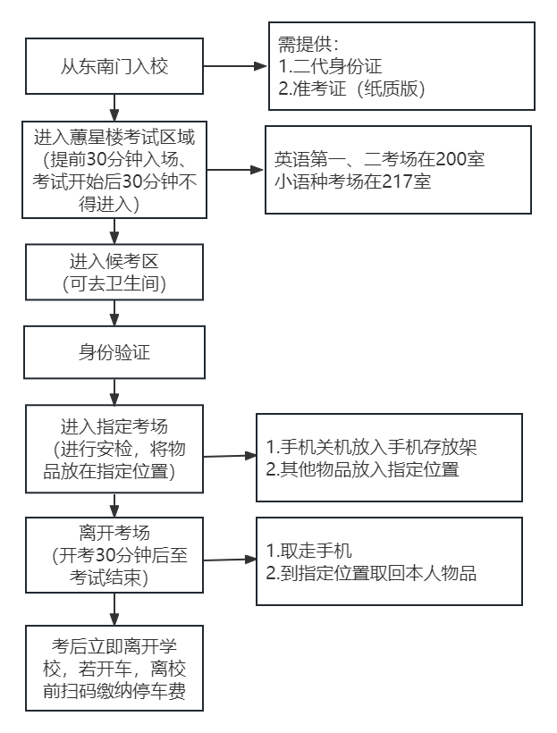 四、考生入校从东南门进入,需出示二代身份证、准考证(必须为纸质版)。开车入校,限速20km/h,禁止鸣笛,停车费5元/小时,离校前可扫描二维码支付。