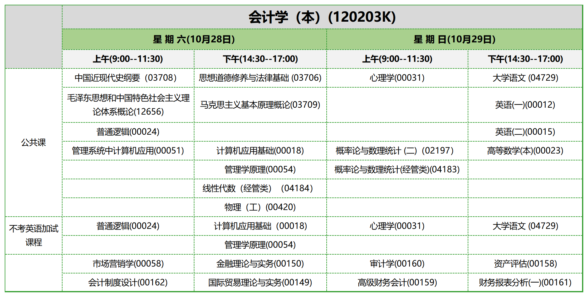 10月考期内蒙古自考公共课考试安排+会计学本科安排如下: