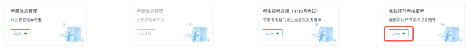 进入自学考试网上报名系统,点击下方“实践环节考核报考”,进入实践环节考核课程报名。