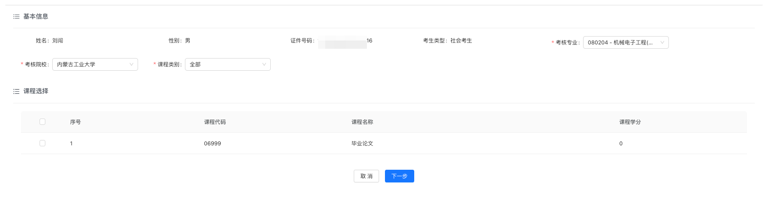 考生通过选择考核专业、考核院校及课程类别搜索选择具体的实践考核课程。
