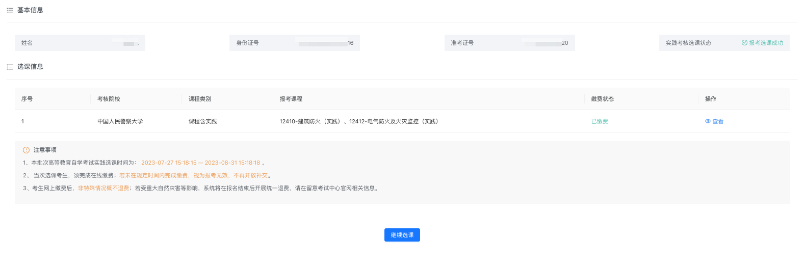 若还需要补报别的时段的课程,可以点击“继续选课”,再次进行选课。