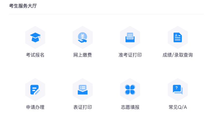 2、成功打开网站后,找到并点击标示为“自学考试”的模块,找到并点击“报名报考系统”按钮,进入内蒙古自治区教育招生考试中心考生综合服务平台。