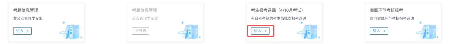 进入自学考试网上报名系统,点击下方“考生报考选课(4/10 月考试)”入口,进入统考课程选课流程。