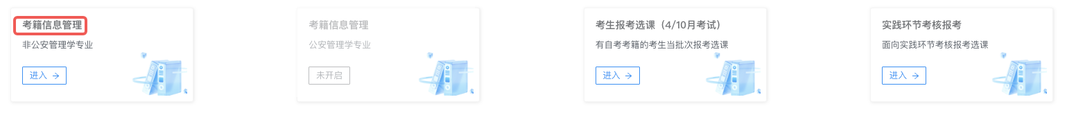 老考生在系统已有考籍,进入“自学考试网上报名系统”,页面入口显示为“考籍信息管理”。进入考籍信息管理,可点击“信息更新”按钮进行部分考籍信息资料更新。