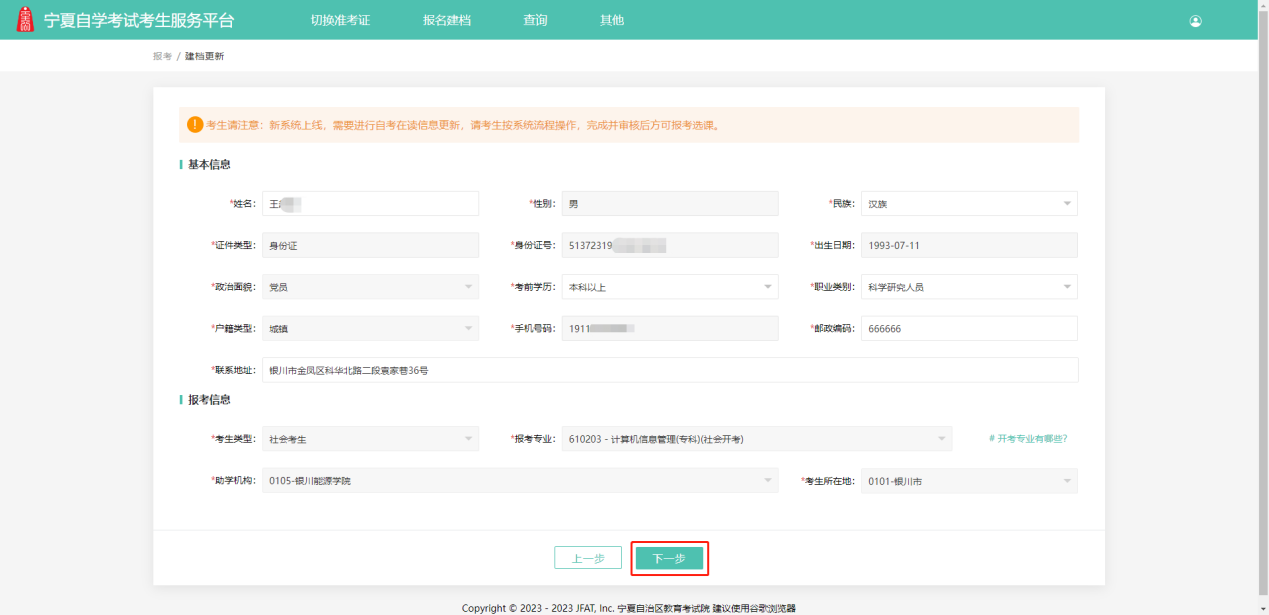 考生完成信息更新后,请再次确认信息,确认无误后点击“下一步”。