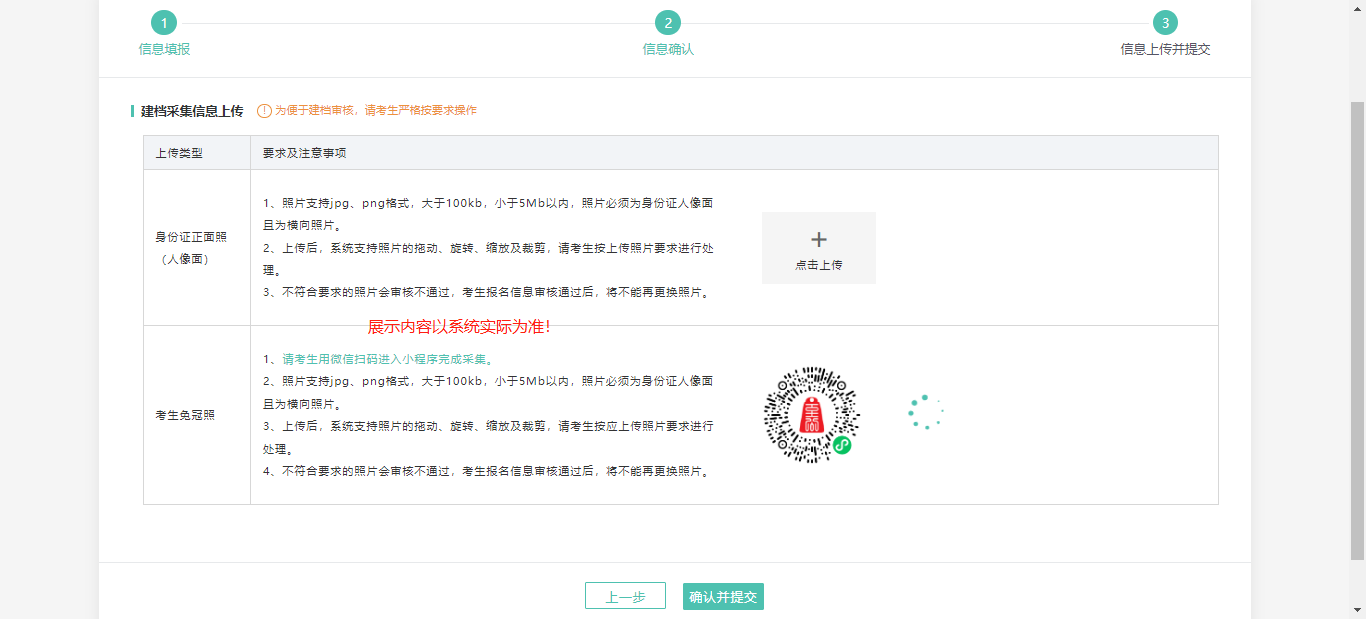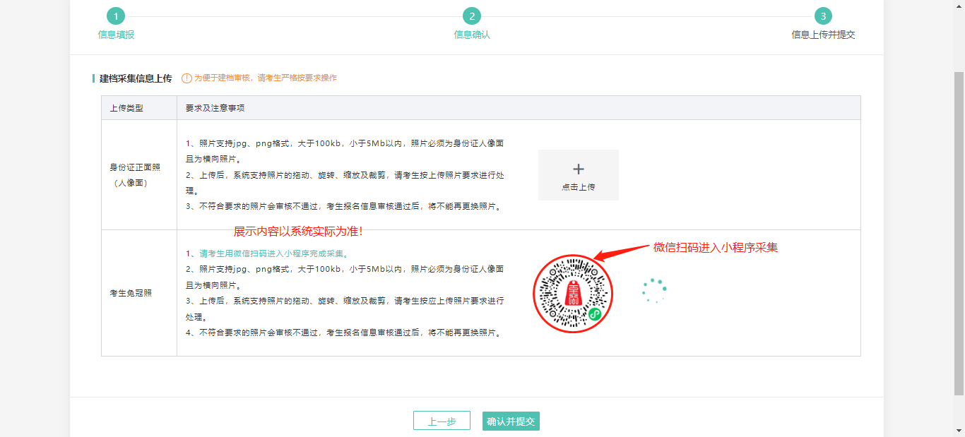 信息上传并提交进入信息上传并提交页面后,考生请按要求,上传身份证正面照片、使用微信扫码进入小程序完成免冠照片采集。