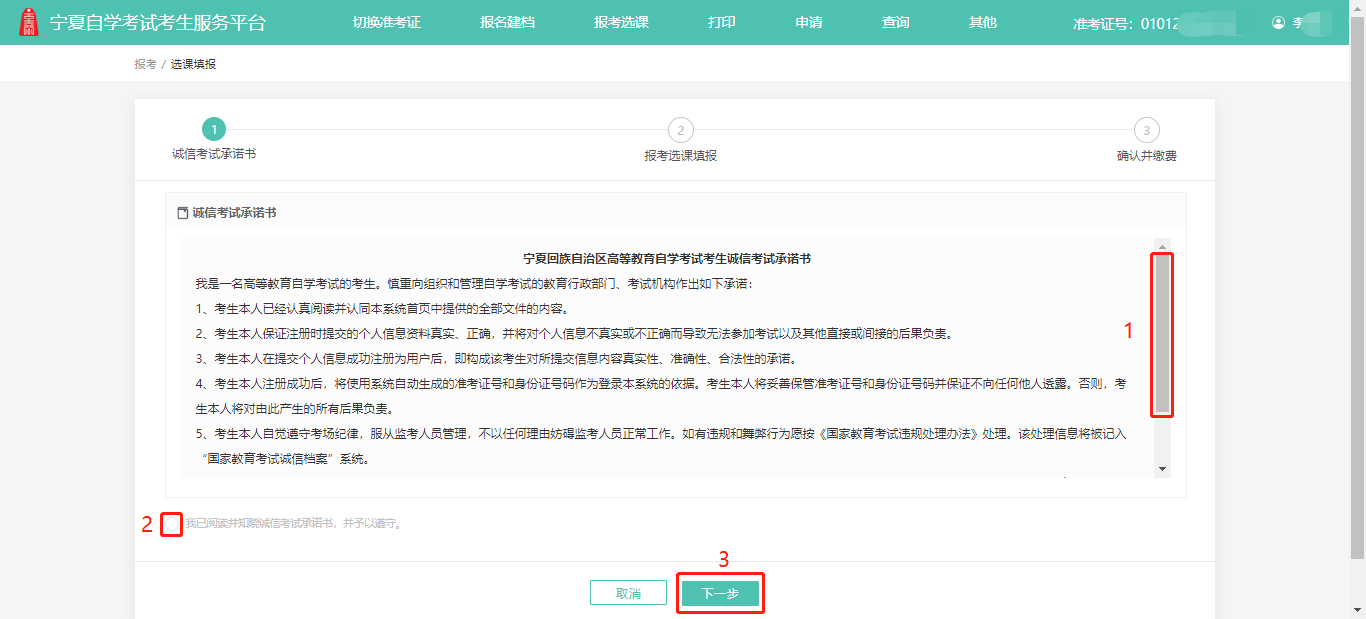 在报考选课页,点击“我要报考”进入下一步,滚动阅读框并勾选“我已阅读并知晓诚信考试承诺书,并予以遵守。”完成后点击“下一步”。