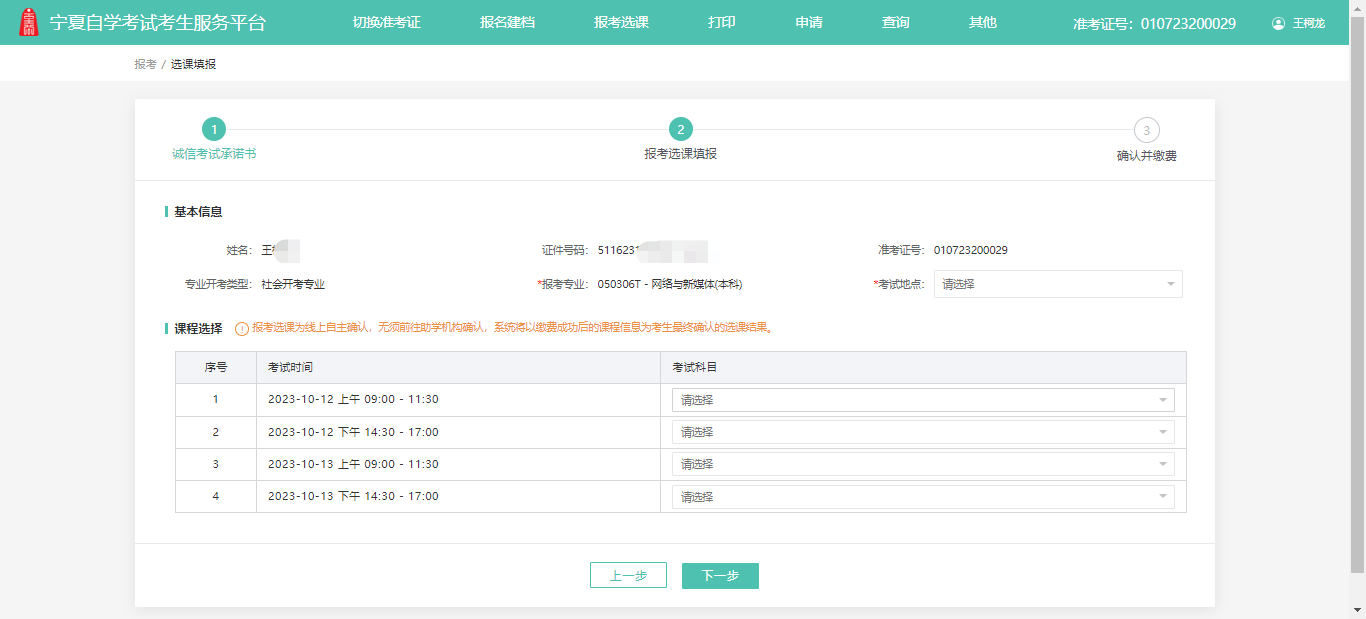 进入报考选课填报页面后,请考生根据自身情况选择当次的“考试地点”和所要报考的课程(已合格的课程,无须再报考)。