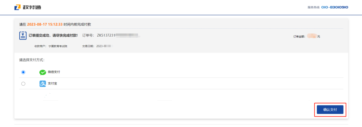 点击“确认”后,将跳转支付平台,考生请根据个人情况选择对应的支付方式并点击“确认支付”。