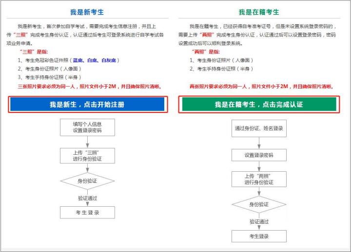新系统取消了现场确认环节,采用线上身份认证,分为“新考生”和“在籍考生”两类。1、新考生首次报考需要上传“证件照(蓝底、白底、白灰底免冠彩色照片)、身份证人像面照、手持身份证照”,系统认证通过后即获取报名资格,便可登录系统进行报考缴费。