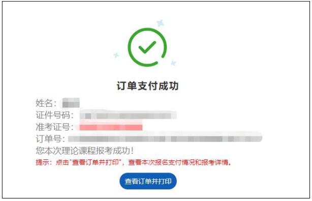 7、订单支付成功,考生生成准考证号,考生可点击下方按钮“查看订单并打印”,进行报考信息的查看与打印。如需打印报考信息可点击报考详情页下方“打印”按钮。