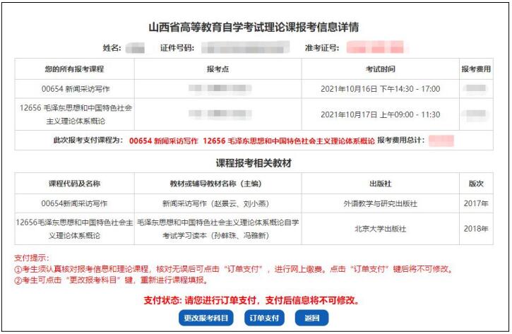 4、保存成功后查看本次报考信息详情,再次核对报考信息和理论课程。核对无误后点击“订单支付”,进行网上缴费。注:点击“订单支付”按钮后考生报考信息将不可修改。