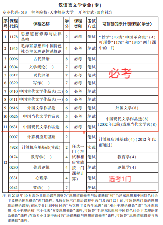 天津自考汉语言文学专科毕业需要考过12门课程(如下图所示),其中,有11门课程为必考笔试课程,1门为选考笔试课程。