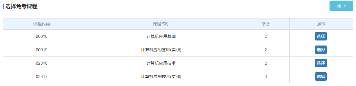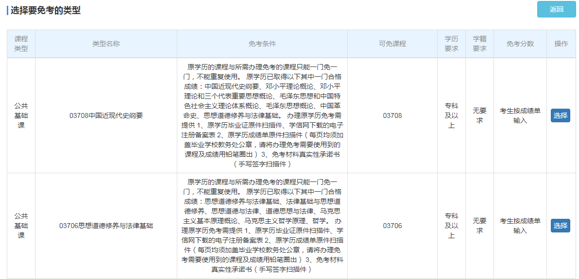 选择完免试类型后,会进入选择免试课程页面,如图所示: