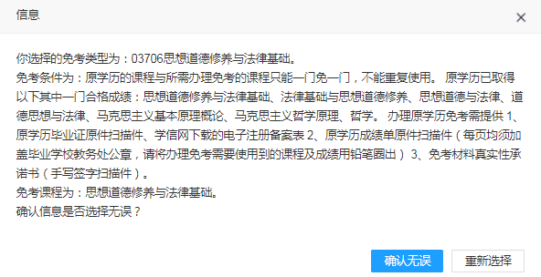 第三步:点击“选择”按钮,选择申请免试的课程之后,弹出确认页面: