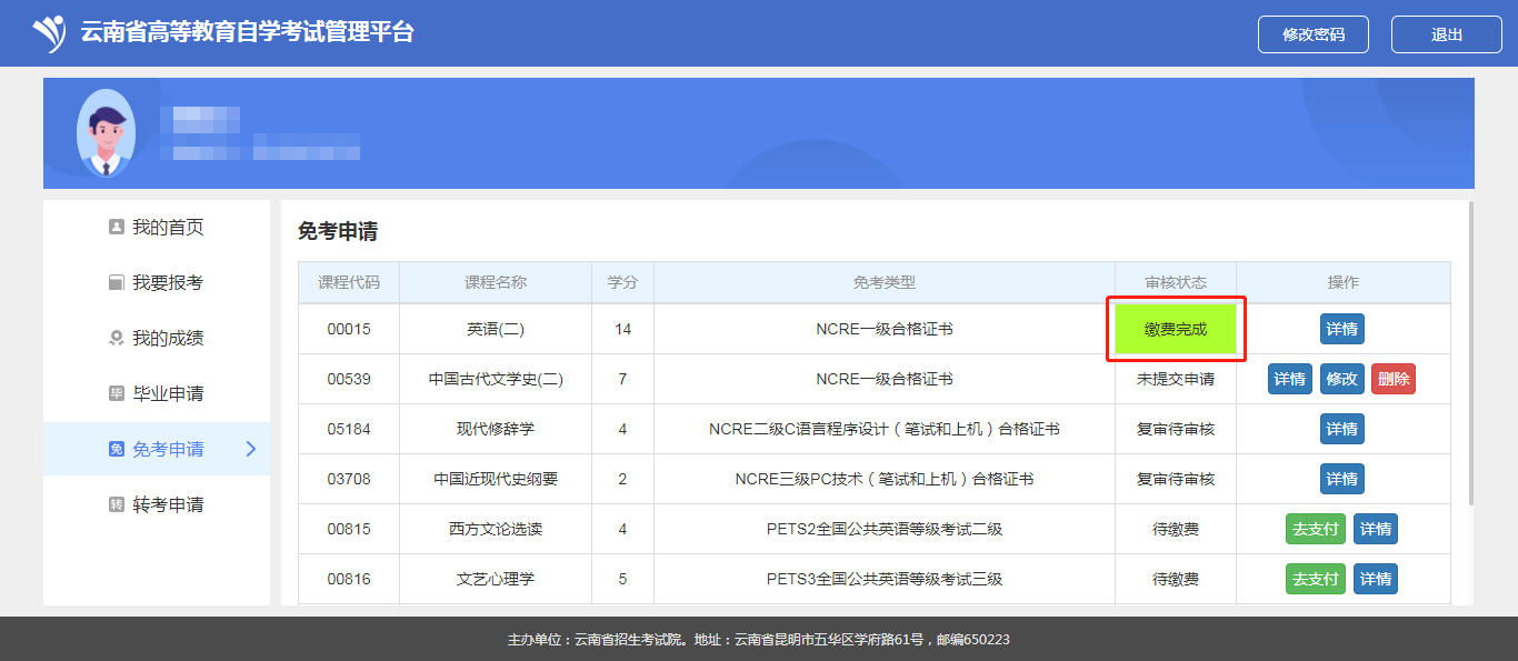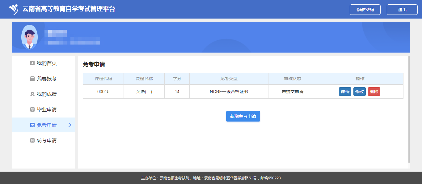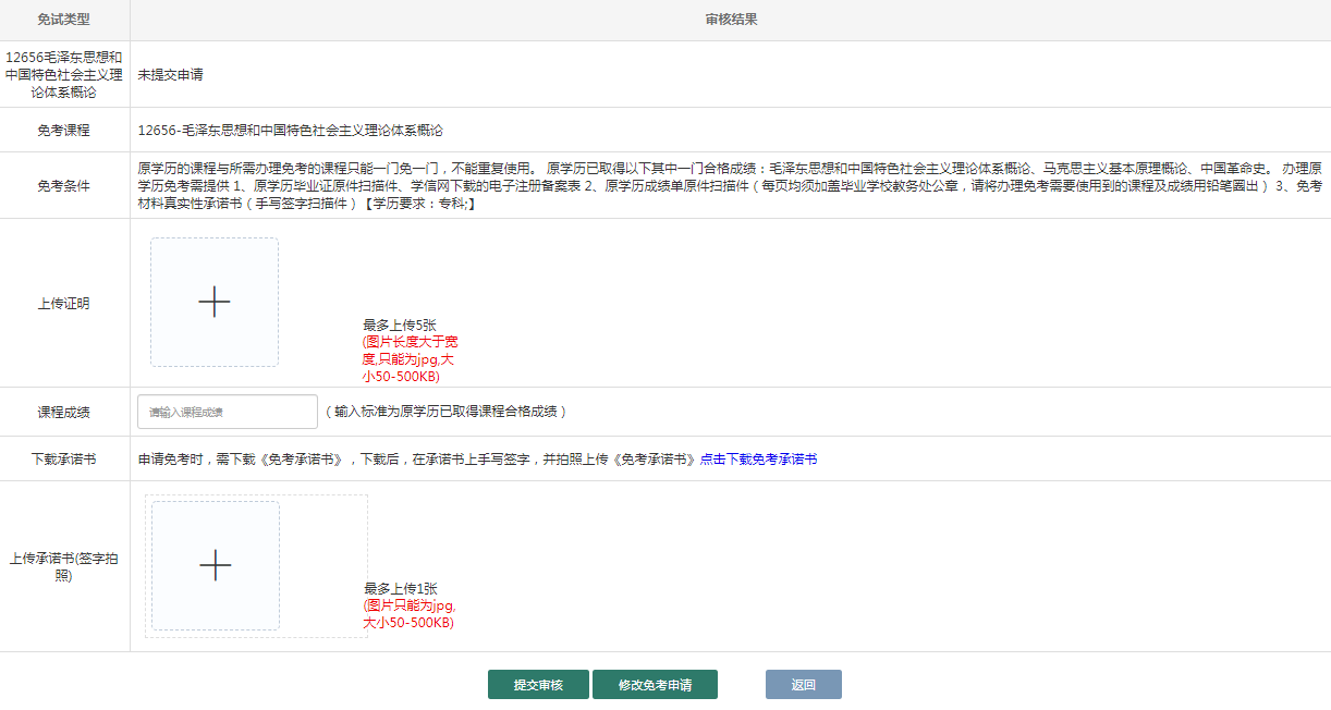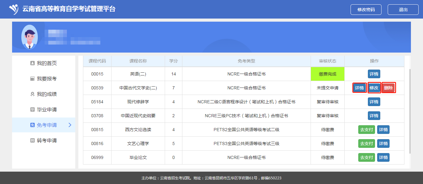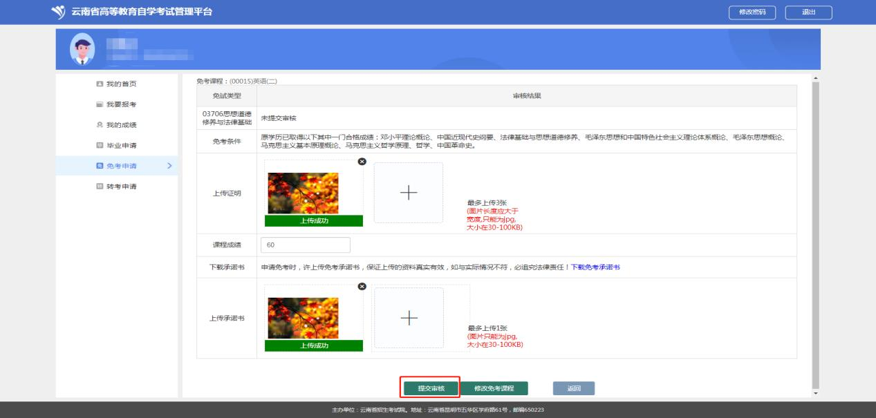 在未提交审核之前,可以点击“修改免考课程”,重新选择需要免试的课程。