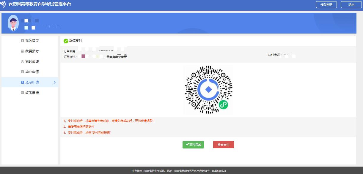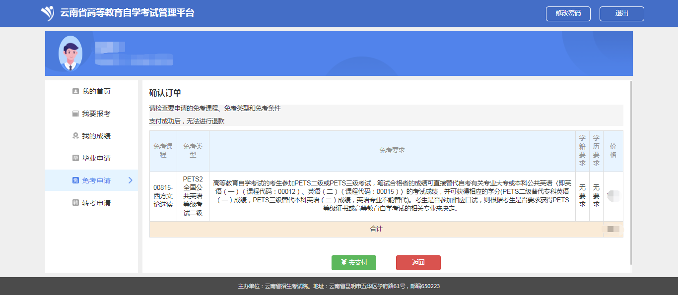 第八步:确认订单后缴费,审核完成之后,考生确认课程和免考类型无误后,进行支付,支付完成之后,免考申请完成,免考成绩有效。