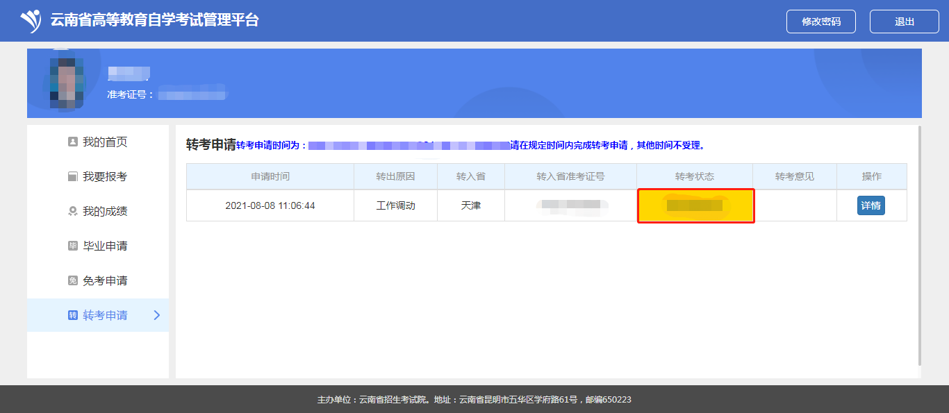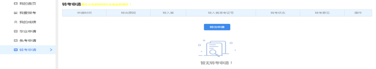 1.审核不通过:根据考生提交的转出申请的审核,请考生根据转考审核意见修改转出申请。