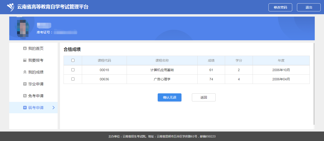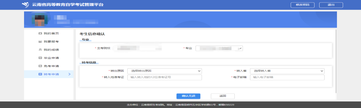 第二步:点击“转出申请”,会弹出考生信息确认页面,考生根据实际情况填写转考信息即可: