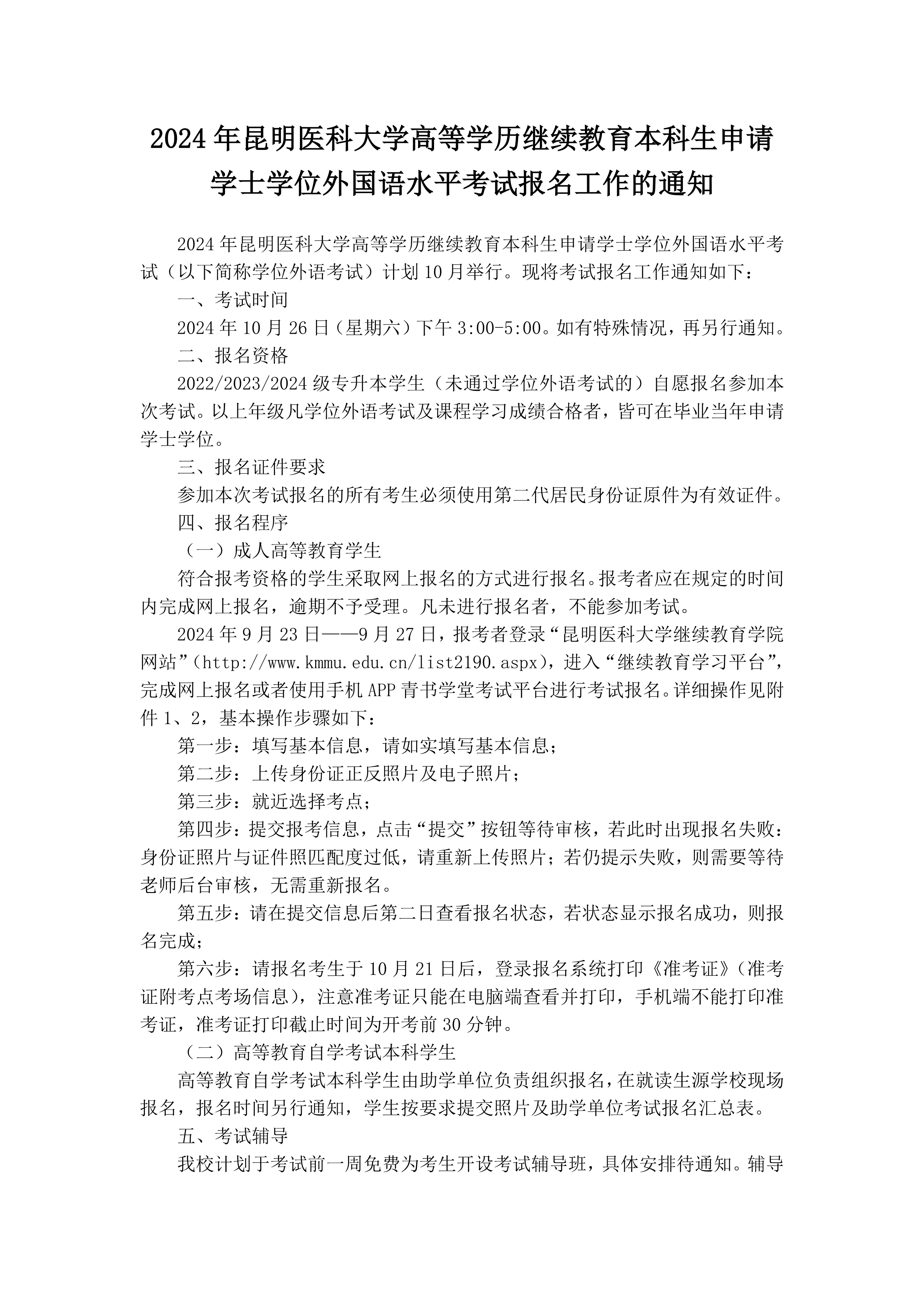 2024年昆明医科大学高等学历继续教育本科生申请学士学位外国语水平考试报名工作的通知