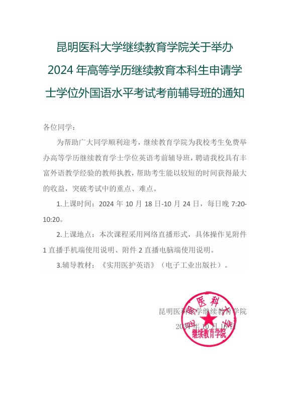 昆明医科大学关于举办2024年高等学历继续教育本科生申请学士学位外国语水平考试考前辅导班的通知